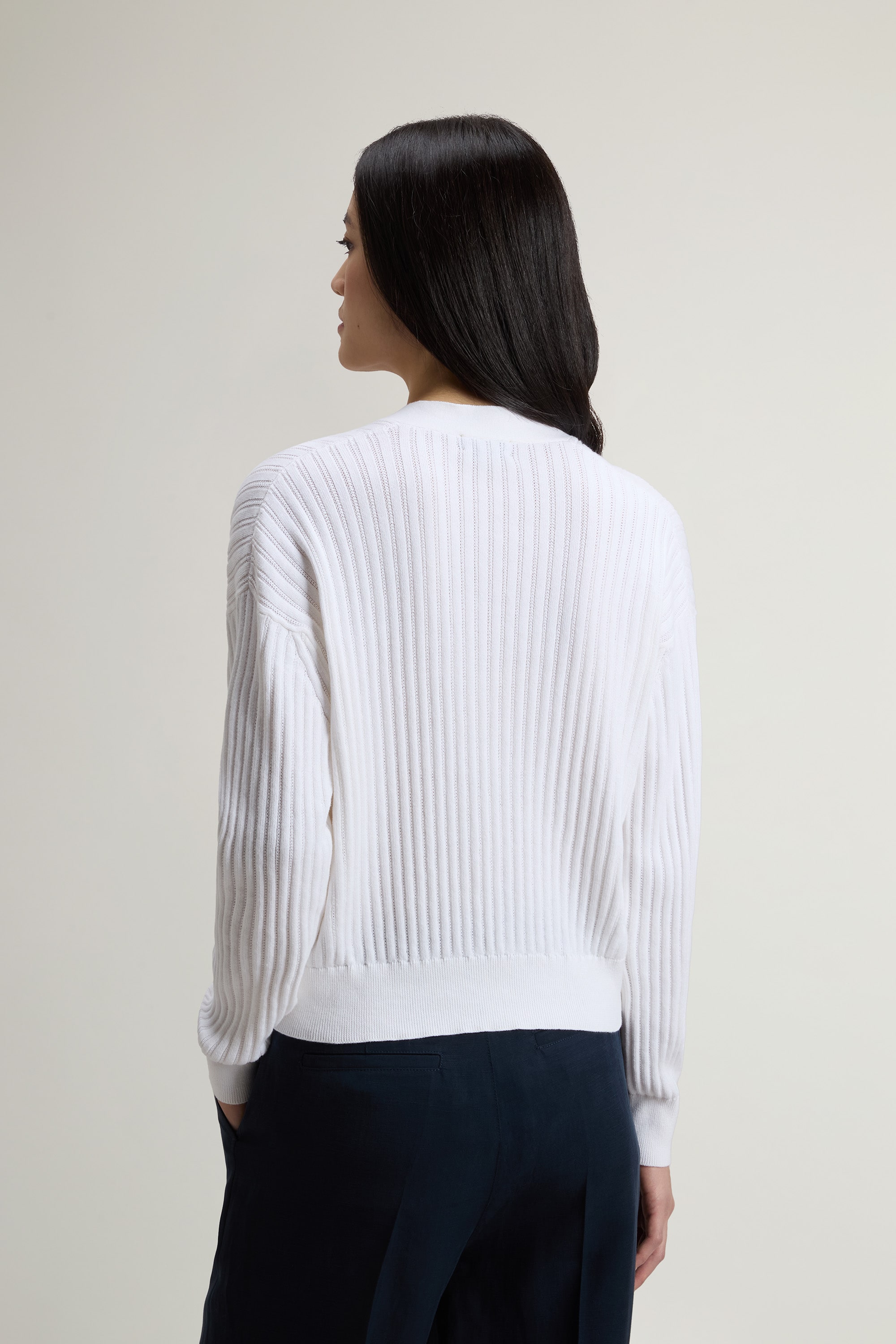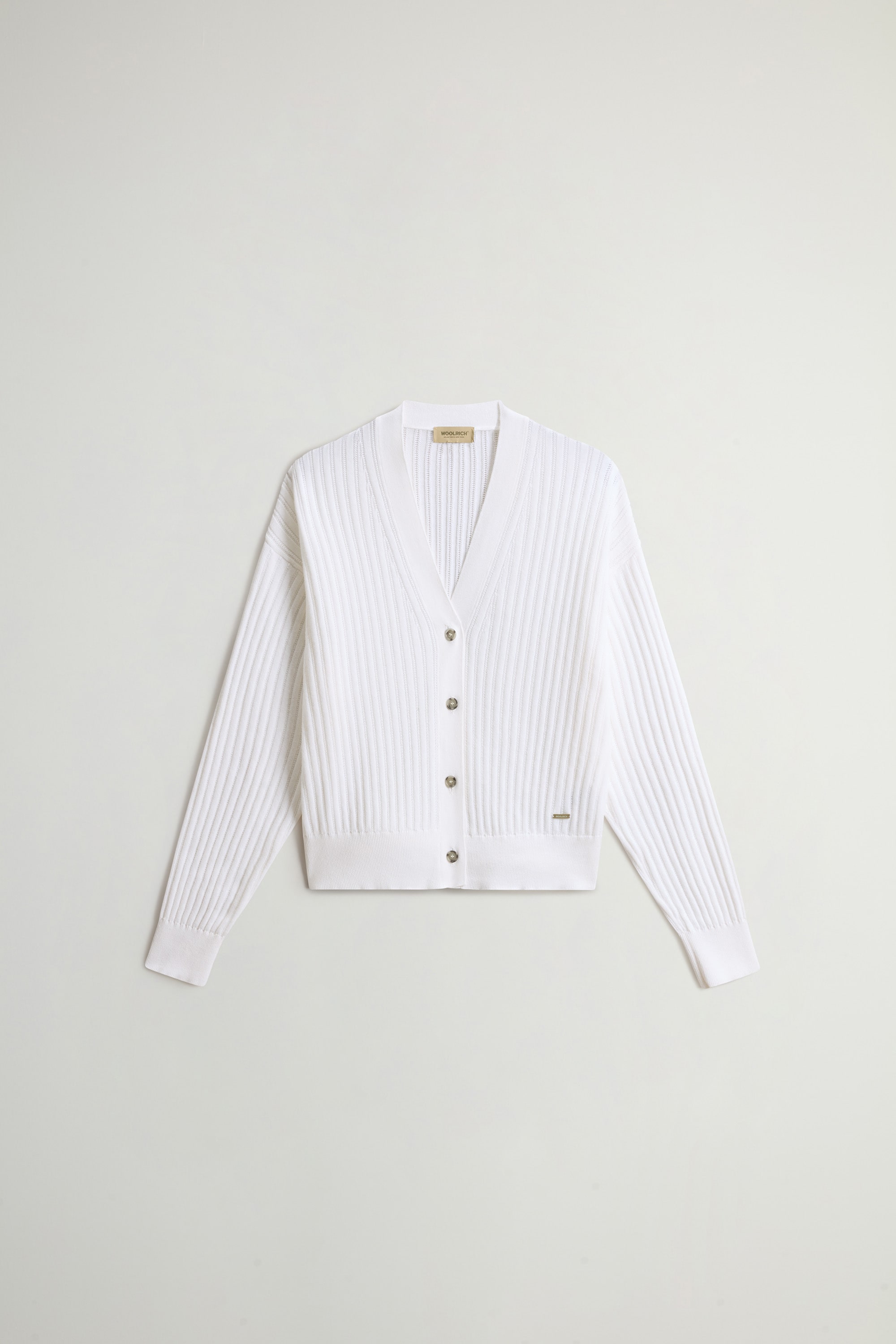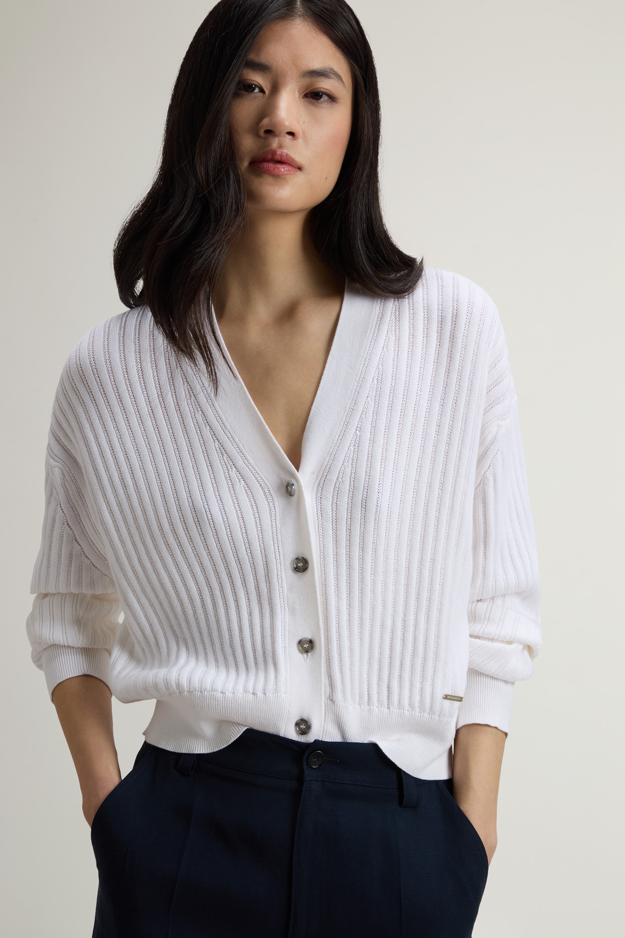 柔らかくなめらかなタッチのコットン糸を使用した、12ゲージのモスステッチ編みニットカーディガン。